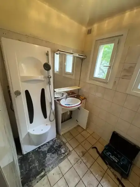 Cette salle de bain, équipée d’une cabine de douche et d’un carrelage daté, a été entièrement déposée puis repensée pour gagner en confort et en modernité. L’objectif : repartir sur des supports sains, sécuriser l’étanchéité, et créer un espace plus élégant et fonctionnel au quotidien.