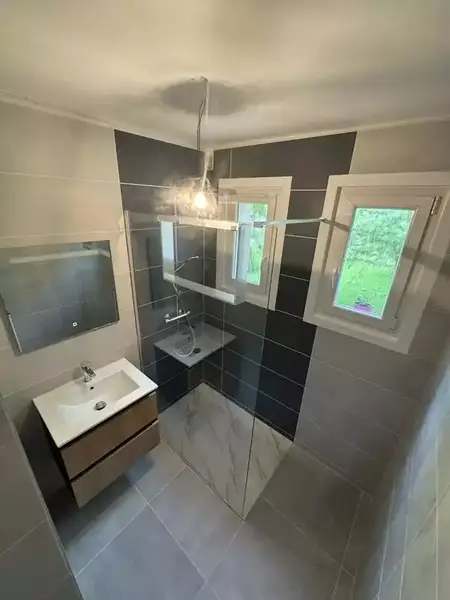 Après préparation et étanchéité des supports, une douche à l’italienne a été réalisée avec un receveur effet marbre. Un carrelage grand format a ensuite été posé au mur et au sol. L’ensemble est complété par un meuble vasque suspendu, un miroir LED, une paroi vitrée et une colonne thermostatique. Résultat : une salle de bain moderne, harmonieuse et agréable à utiliser, avec un rendu haut de gamme.