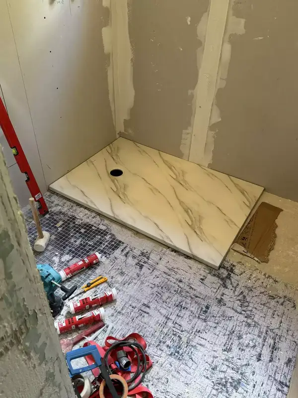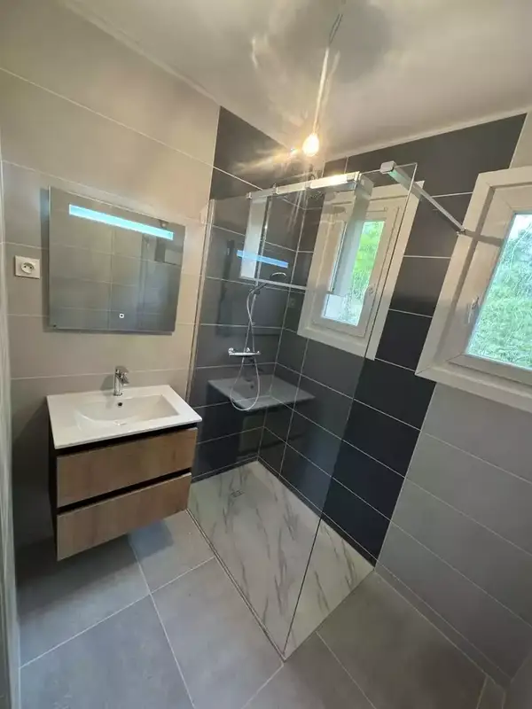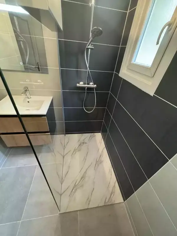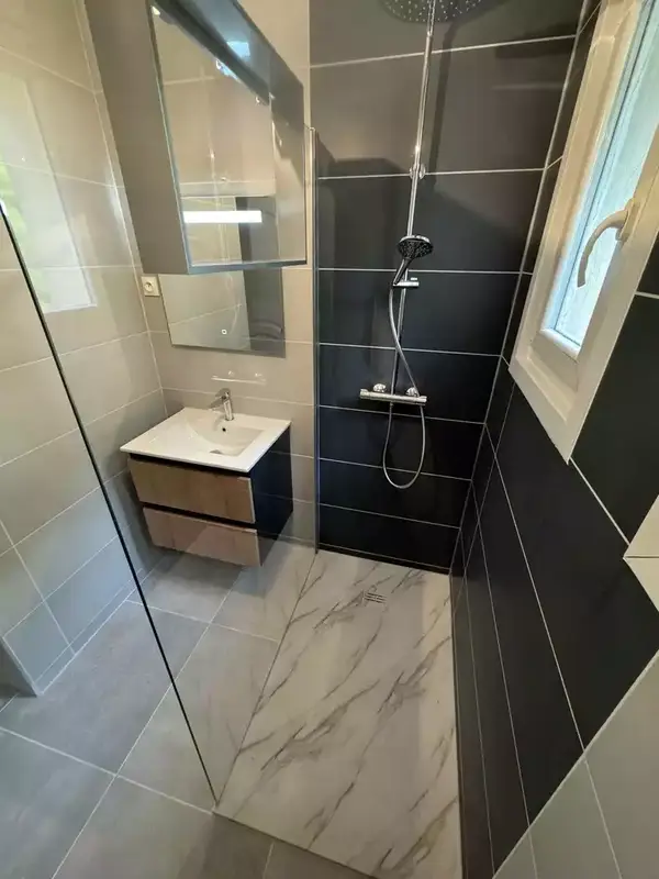 Après préparation et étanchéité des supports, une douche à l’italienne a été réalisée avec un receveur effet marbre. Un carrelage grand format a ensuite été posé au mur et au sol. L’ensemble est complété par un meuble vasque suspendu, un miroir LED, une paroi vitrée et une colonne thermostatique. Résultat : une salle de bain moderne, harmonieuse et agréable à utiliser, avec un rendu haut de gamme.