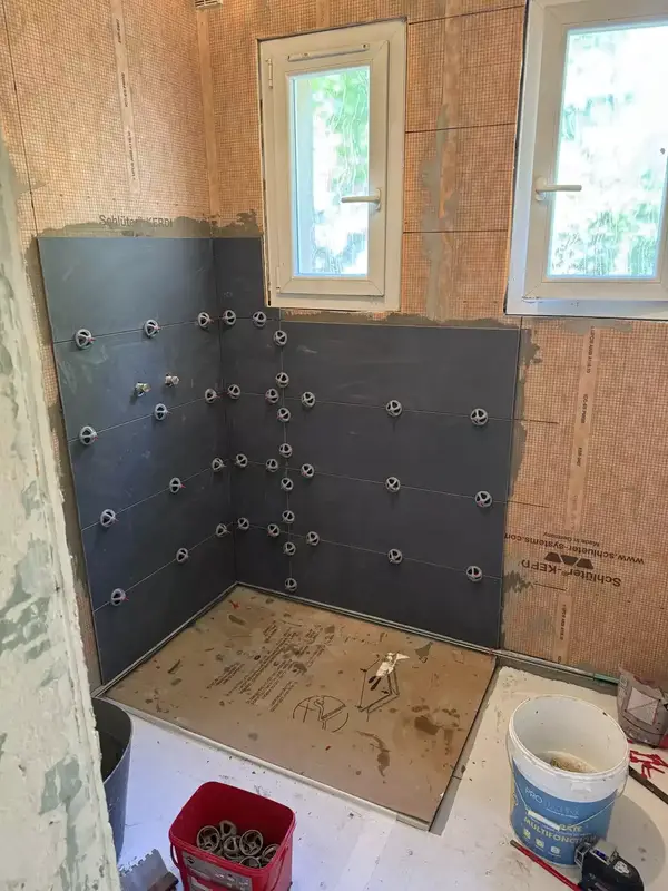 Cette salle de bain, équipée d’une cabine de douche et d’un carrelage daté, a été entièrement déposée puis repensée pour gagner en confort et en modernité. L’objectif : repartir sur des supports sains, sécuriser l’étanchéité, et créer un espace plus élégant et fonctionnel au quotidien.